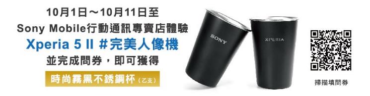 最後還有一件很重要的事,那就是凡於 2020 年 10 月 1 ~ 10月 11 日止,至全台 Sony Mobile 行動通訊專賣店,除了能搶先體驗 Xperia 5 II 嶄新功能外,現場體驗並完成問券,即可獲得「時尚霧黑不鏽鋼杯」一只(數量有限送完為止)。