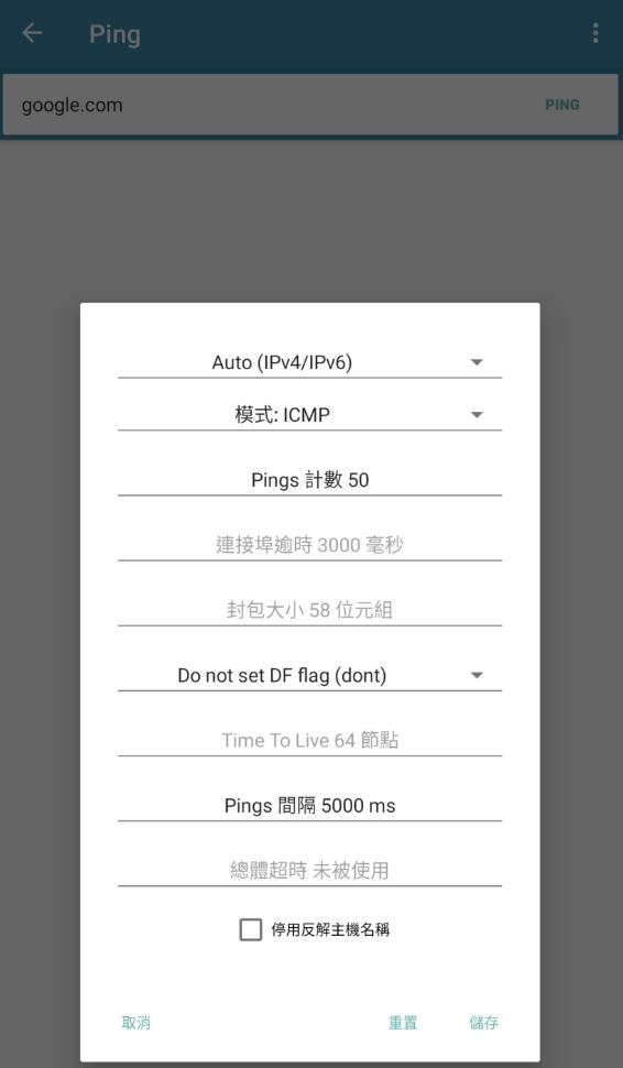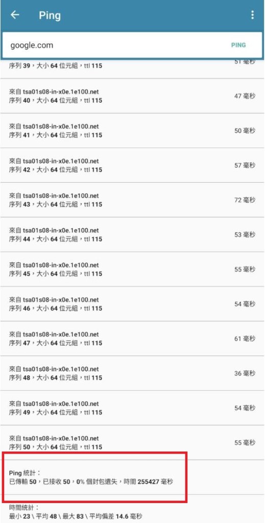 測試電信商業者為自用遠傳電信、台灣之星,並透過PingTools APP,統一設定參數為 計數 50 間隔 5000ms。
