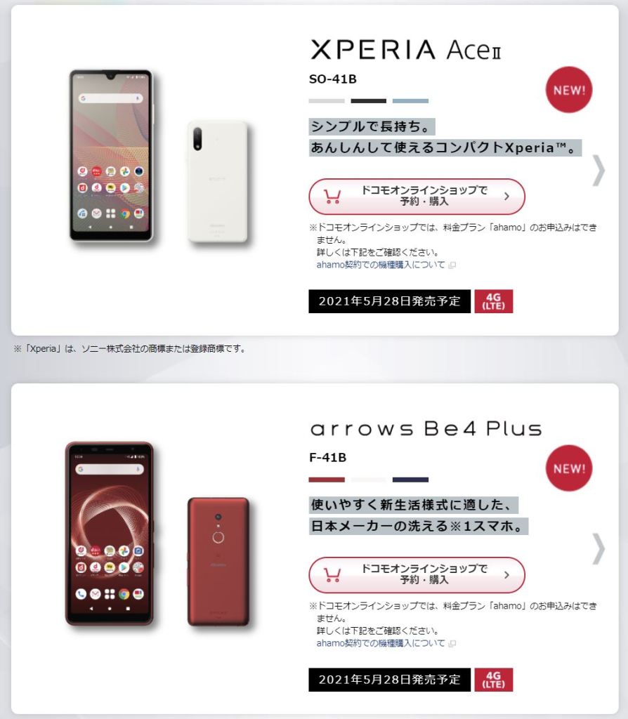 稍早日本電信商 NTT Docomo 發表了兩款 4G LTE 手機,分別為 Xperia Ace II SO-41B 與 arrows Be4 Plus F-41B,均為電信商訂製款,後續並不會提供海外販售服務,而且相關硬體配置也並非市場主流,僅適合輕度手機用戶使用,手機將於5月28日推出。