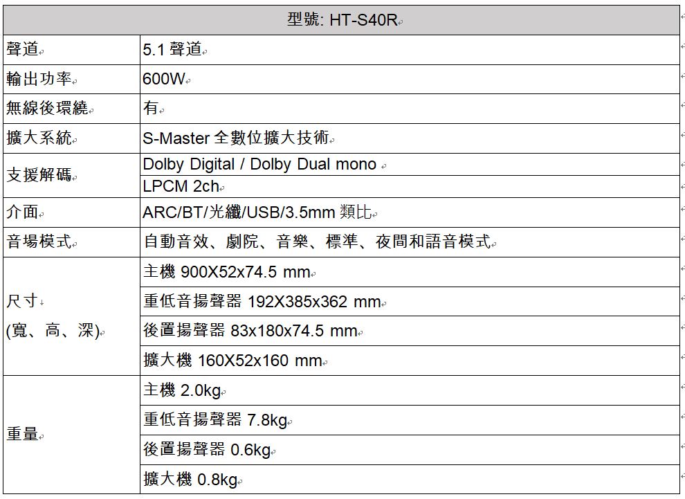 HT-S40R提供600W輸出功率,組件為三聲道單件式環繞音響和重低音揚聲器,並配備一對無線後環繞揚聲器,前後音場完整包覆,不僅提供全音域震撼聽感,更提供完整360度實體環繞音效前後呼應,支援居家影視或各式娛樂音效達到親臨現場的逼真體驗;HT-S40R同步配備Dolby Digital 音效解碼,可傳遞更高規格的視聽享受,輸入介面更提供多樣的HDMI ARC、光纖與3.5mm類比連接埠,滿足各式音源輸入規格,且搭載藍牙連線功能連結串流音樂,輕鬆播放喜愛的音樂清單,營造豐富的居家空間氛圍。
