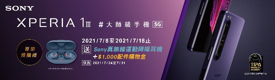 「Xperia 1 III上市首購活動」:即便錯過 Xperia 1 III 早鳥預購活動,自7/19起推出上市後,Sony 還規劃了 Xperia 1 III 首購活動!自2021年7月19日至2021年9月30日止,至全台各手機販售通路,包含實體門市、線上購機、電信通路,不論單機選購或是搭配優惠資費方案,選購任一款Xperia 1 III大師級5G旗艦手機,上網完成登錄即可獲得Sony運動藍牙入耳式耳機(WI-SP510,市價2,690元) 。