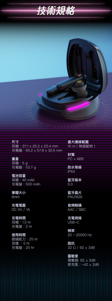 而這次要介紹的新品 SOUNDPEATS Gamer No.1,是專為電競玩家所研發的無線耳機, 承襲頂尖重低音效霸主實力,採用經典雙動圈單體,並提供超低延遲+環繞音效混合遊戲模式。收納充電盒及耳機本體均加入電競設計元素,尤其是搶眼的充電艙 RGB 五色燈光,提供視覺與聽覺的娛樂體驗!