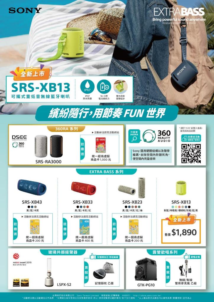 微解封的小旅行,不妨讓好聲音陪伴營造輕鬆氛圍,具備強勁重低音動感音效的EXTRA BASS 系列無線藍牙喇叭,於促銷活動期間購買註冊即送 NT$200~NT$400 超商商品卡;另外,選購簡約流線外型設計、輕巧單機就能營造360度立體環繞聆聽效果的無線揚聲器SRS-RA3000,註冊就送統一超商虛擬商品卡NT$1,000,Sony無線揚聲器動靜皆宜,享受音樂隨處可行。