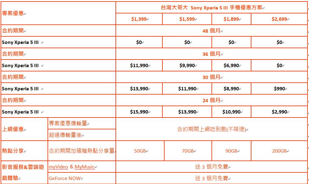 此外大家最關心的電信資費,Sony Mobile也攜手中華電信、台灣大哥大、遠傳電信於9月24日起共同推出優惠資費方案,此次特別規劃月付1399元綁約48個月,就能以0元帶回Xperia 5 III(單機參考建議售價29,990元)!