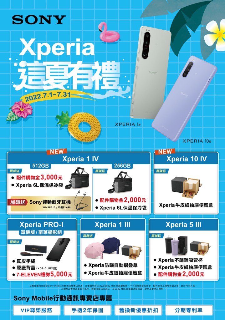 Sony Mobile為讓廣大索粉在暑假期間都能帶上Xperia新機與家人快樂共遊,享有全方位的行動娛樂體驗,特別規劃於全台行動通訊專賣店祭出Xperia指定機型強檔購機優惠活動!即日起至2022年7月31日止,至Sony Mobile行動通訊專賣店選購抓拍錄影 神清晰的Xperia 1 IV 512G版本,可享「Xperia 6L保溫保冷袋」及3,000元配件購物金,登錄再送Sony運動藍牙入耳式耳機WI-SP510 (數量有限,恕不挑色);選購Xperia 1 IV 256G版本,也可獲得「Xperia 6L保溫保冷袋」及2,000元配件購物金!選購極輕萬元防水夜拍機Xperia 10 IV,不僅上網完成登錄可獲得首購禮「極輕潮旅包」,Sony Mobile行動專賣店獨家再送「Xperia 牛皮紙抽屜便籤盒」;選購真.相機手機Xperia PRO-I,不論單機購買或選購豪華攝影組,均可獲得「原廠真皮背蓋(XQZ-CLBE) + 訂製真皮手繩」,再享5,000元7-11購物禮券!Sony Mobile也針對Xperia 1 IV、Xperia 10 IV、Xperia PRO-I等指定機型,規劃行動通訊專賣店延長一年保固服務,限定機種另享有舊換新與分期零利率等專屬優惠。
