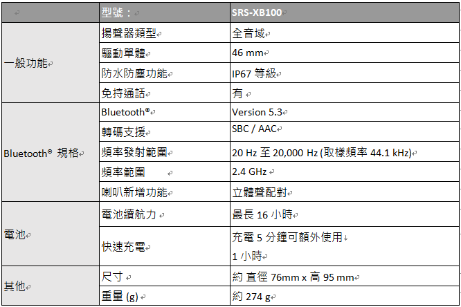 SRS-XB100無線藍牙喇叭搭載USB Type-C®連接埠,具備可連續使用高達16小時的長效電池續航力,機身採用IP67等級防水防塵係數設計,高耐用性和隨附方便吊掛的提繩讓享受音樂更不受使用場域限制。