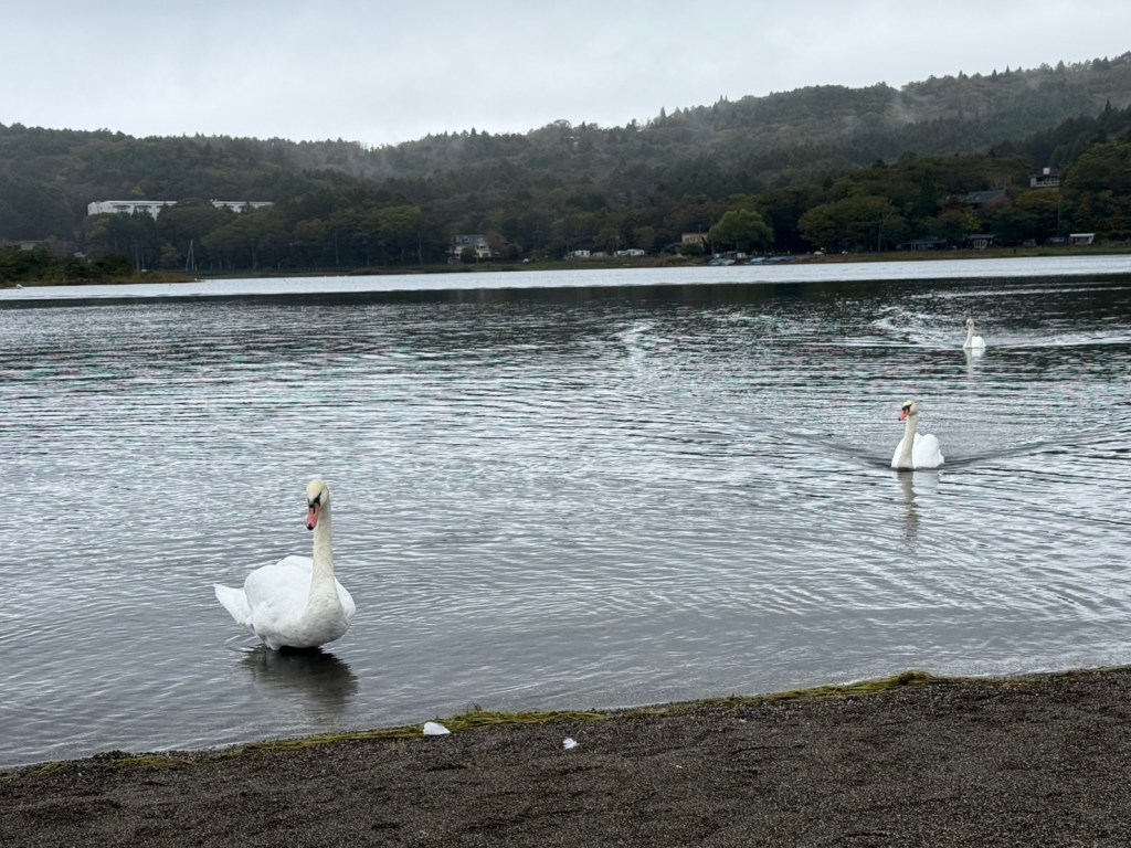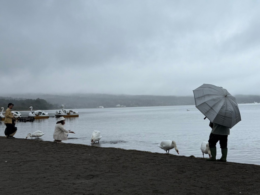當天我們正好遇上下雨,所以稍微調整了原定的行程,首先來到的是山中湖平野之濱。這裡擁有壯麗的自然風景,還能近距離欣賞到宏偉的富士山 ( 結果遇到下雨整個大霧 )。我建議在出發前可以先到便利商店買些食物,到達目的地後,放鬆心情,享受美景和美食,真是如世外桃源般的愜意體驗。山中湖不僅擁有絕美的景色,還是觀賞天鵝(日本稱為白鳥)的絕佳地點。如果你恰巧遇到當地工作人員餵食的時間,他們還會提供少許飼料,讓觀光客有機會親自餵食天鵝。能夠近距離接觸這些優雅的鳥類,真的是一種非常有趣且獨特的體驗。
