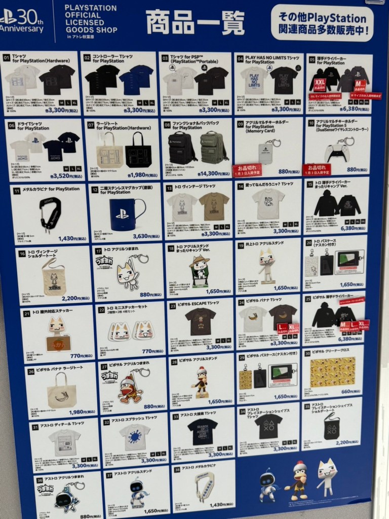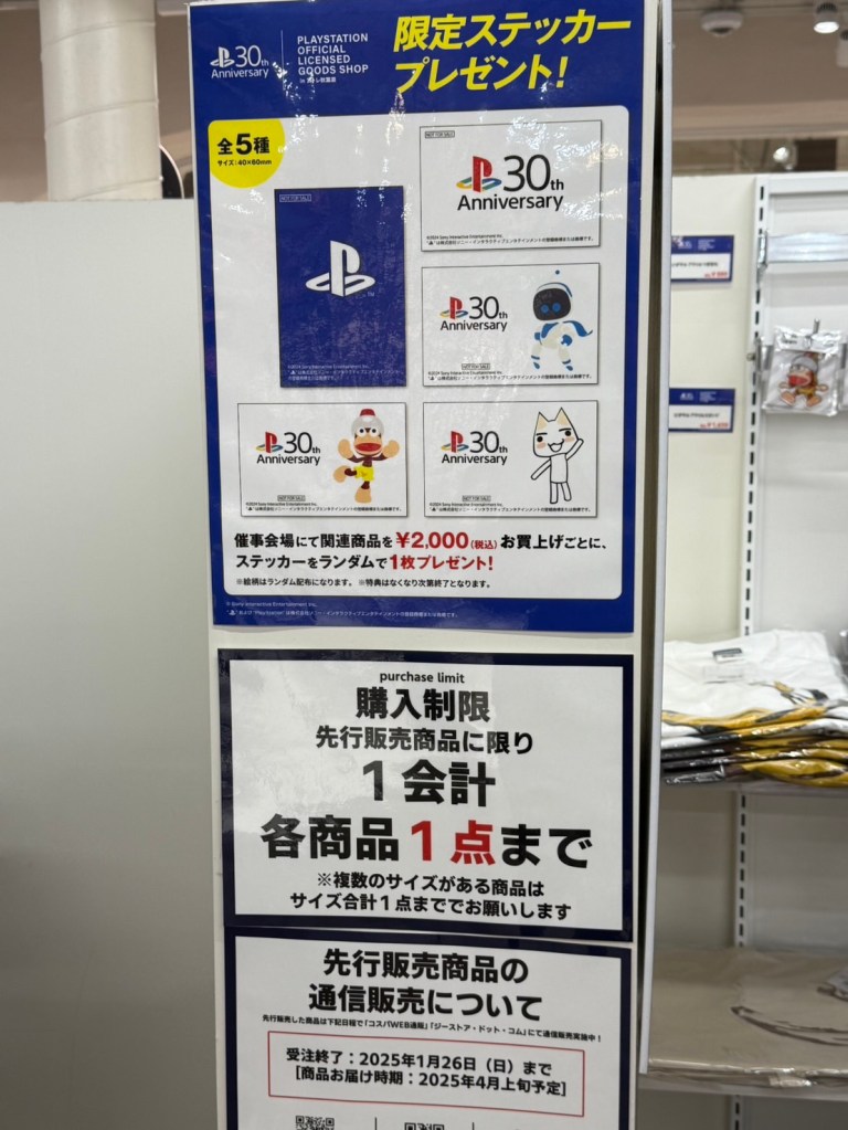 這次去了日本東京旅行,我特地前往秋葉原朝聖動漫聖地。正巧,位於JR車站旁的atré 1有展出PlayStation官方授權商品店快閃店。這次 PlayStation 30週年紀念官方推出了各種聯名商品,不僅有大家熟悉的GU,還有在日本相當受歡迎的nika and…以及扭蛋等商品,幾乎用盡一切方式讓玩家掏錢。而這次我要介紹的是官方自家推出的產品,包括許多吸引人的服飾和配件。此外,還有原定4月才要發售的商品也提前販售,但部分商品限購一件。