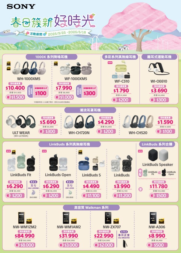 Sony 春日優惠活動自即日起至2025/5/18止登場,BRAVIA 顯示器活動訊息請參考活動網址https://event.sony.com.tw/2025/03/Spring/TV/;耳機、喇叭、數位隨身聽與家庭劇院等產品請參考活動網址:https://event.sony.com.tw/2025/03/Spring/VS/,或洽詢全台Sony直營通路-Sony Store台北遠百信義直營店、Sony Store台北101直營店、Sony Store台北復興直營店、Sony Store台中直營店、Sony Store高雄直營店、Sony客服中心(02-4499111)及各大消費性電子產品通路。